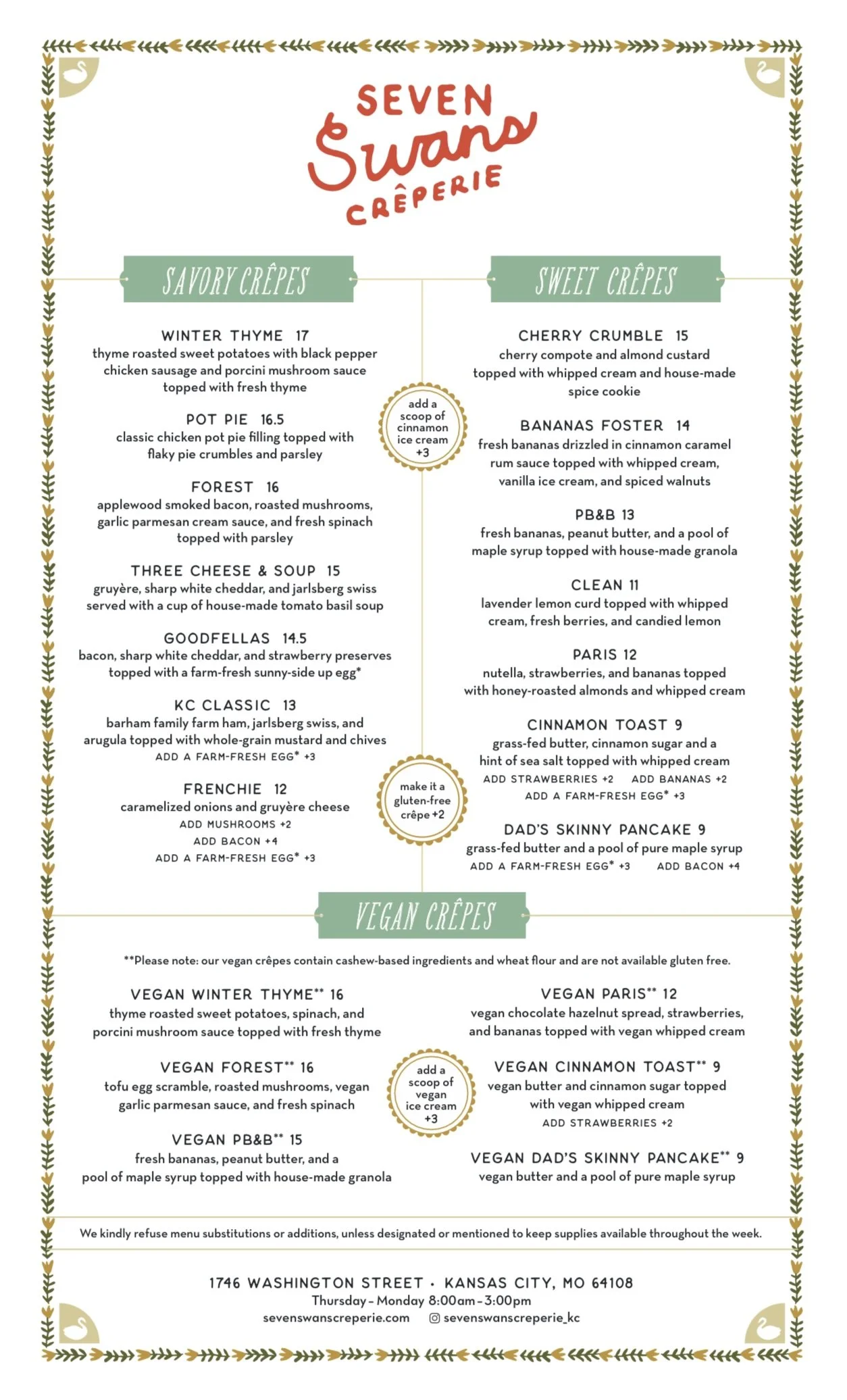 At Seven Swans we change our menu seasonally. Be sure to keep an eye out for fresh, in-season specials at our Kansas City and Milwaukee locations.