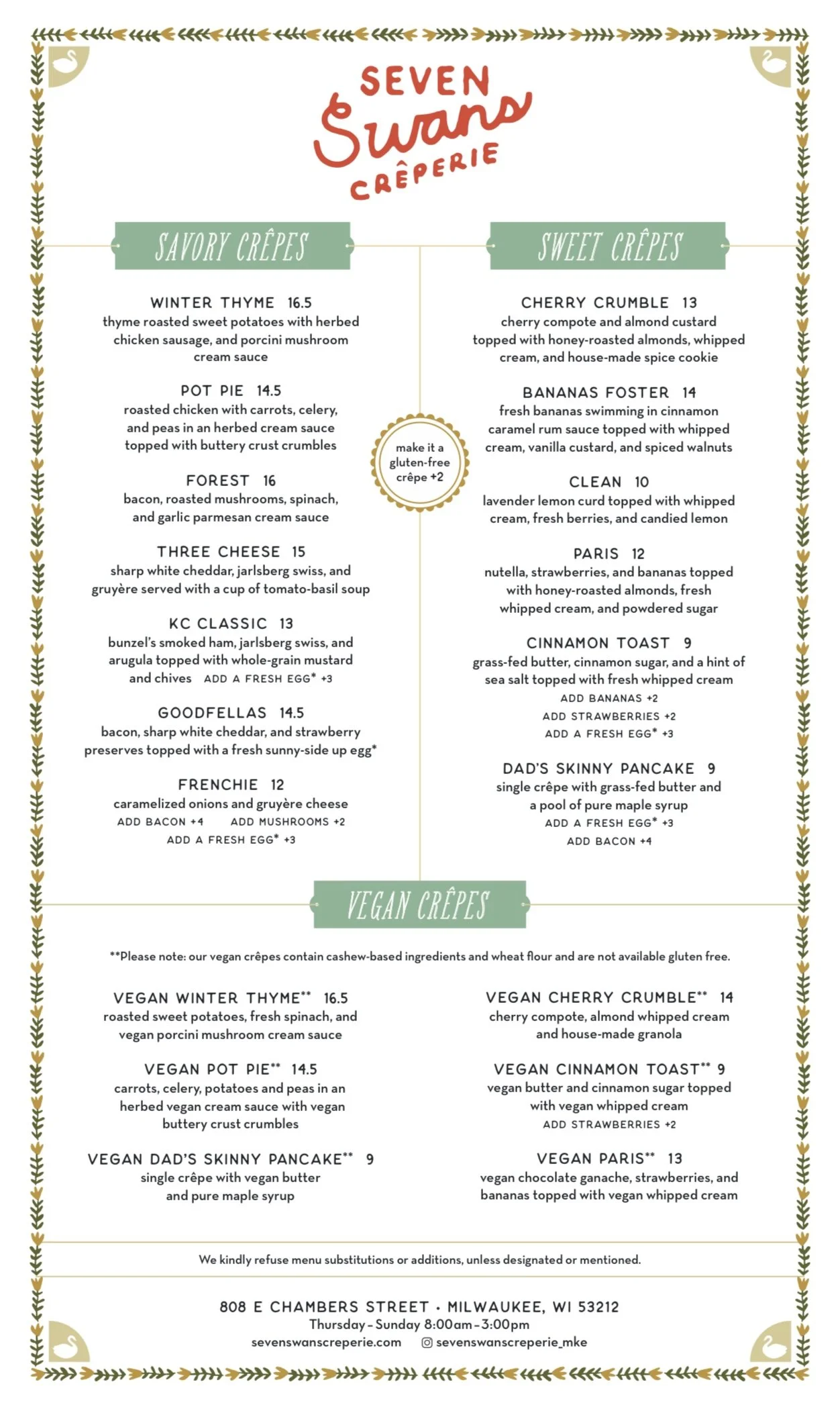At Seven Swans we change our menu seasonally. Be sure to keep an eye out for fresh, in-season specials at our Kansas City and Milwaukee locations.